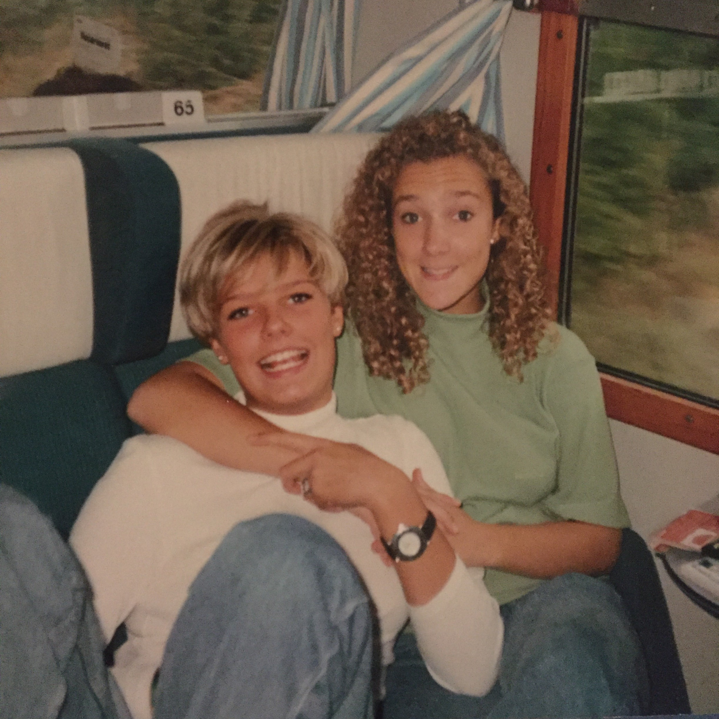 Lejrskole i 9. kl. Min barndomsveninde Ria og jeg i toget (sjældent alvorlig, hvis ikke den ene laver ansigt, så gør den anden) 😉